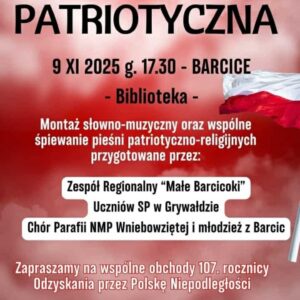 9 XI 2025 w filii Biblioteki Gminnej w Barcicach odbyła się uroczysta wieczornica patriotyczna, upamiętniająca 107 rocznicę odzyskania przez Polskę niepodległości. Wydarzenie zgromadziło licznych mieszkańców Barcic i okolic, dorosłych, młodzież i dzieci –…