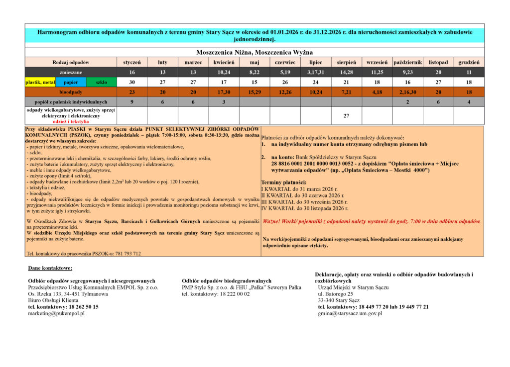 Odpady z budynków przy ul. Leśnej oraz ul. Pasy Leśne odbierane są wg harmonogramu przewidzianego dla sołectw Moszczenica Niżna i Moszczenica Wyżna (harmonogram poniżej).