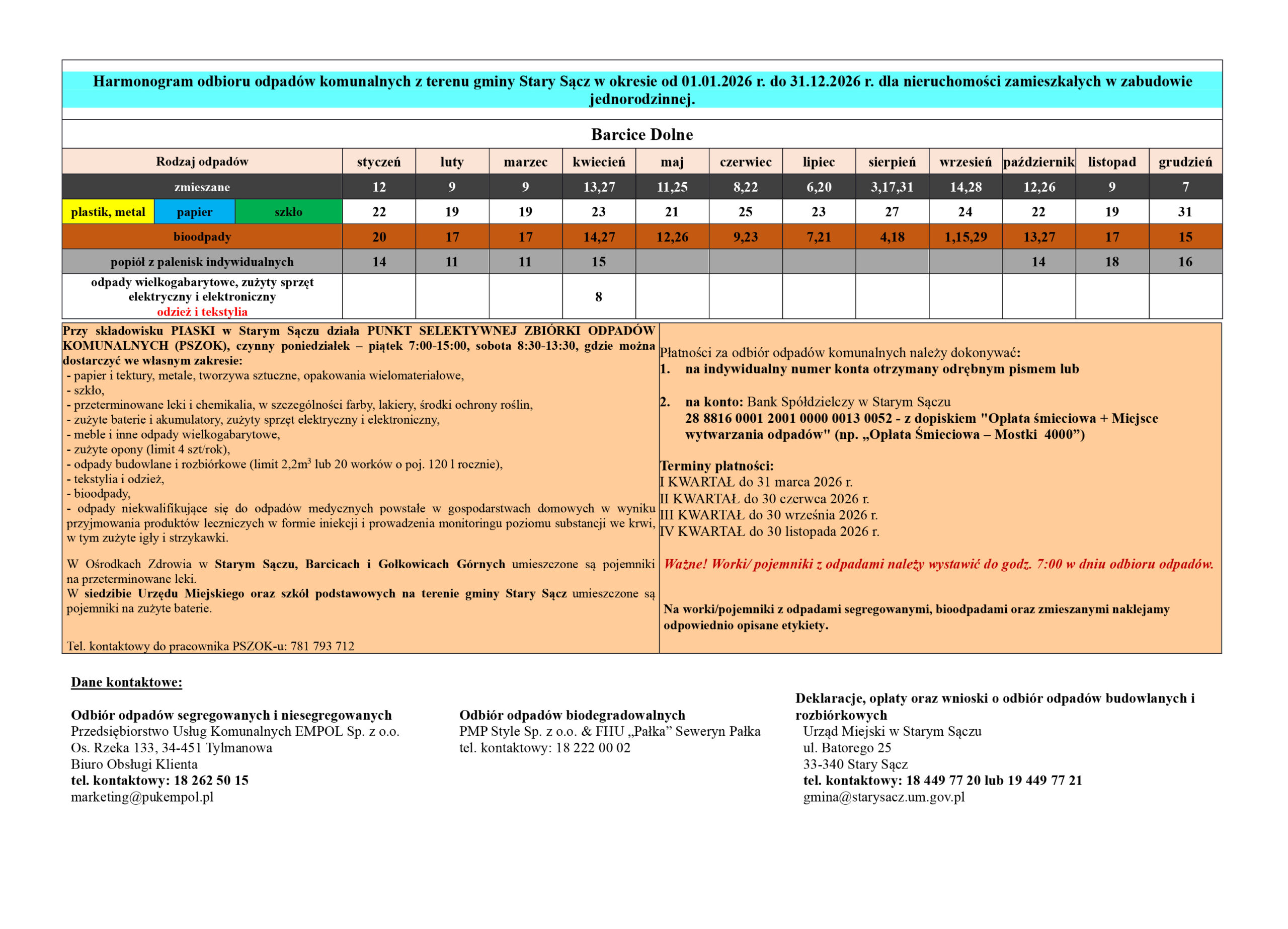 Harmonogram odbioru odpadów komunalnych w 2026 r.