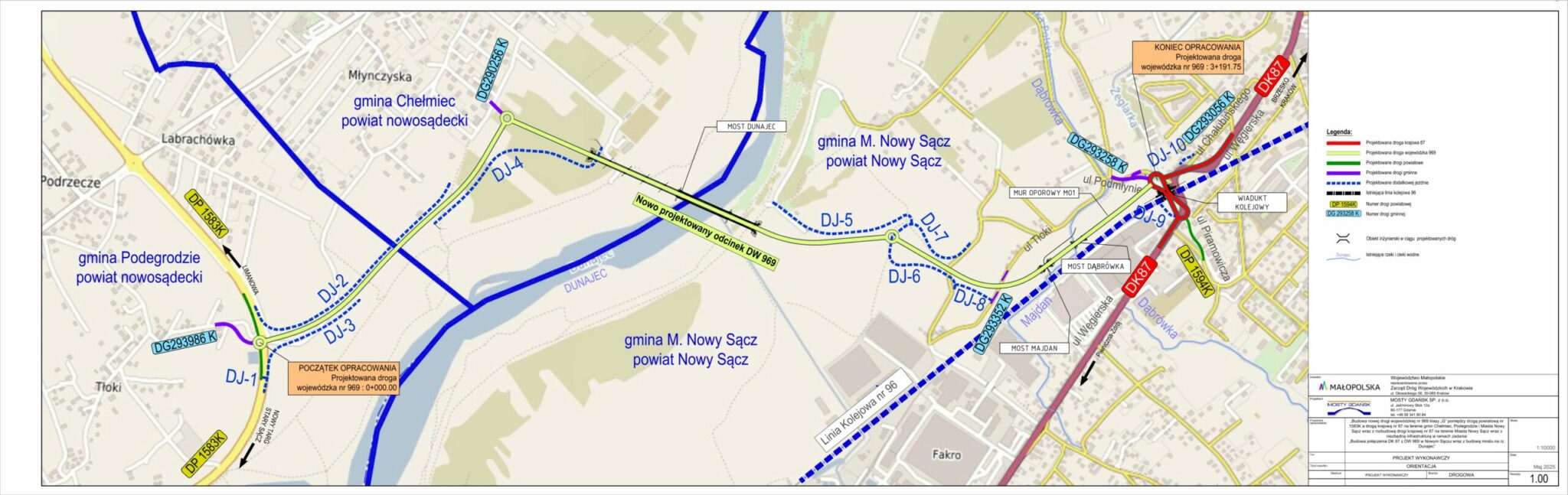 Zakres planowanego zadania obejmuje budowę nowego odcinka drogi wojewódzkiej nr 969, rozbudowę drogi krajowej nr 87 oraz budowę nowego mostu na Dunajcu. Przeprawa połączy miejscowość Świniarsko w gminie Chełmiec z Nowym Sączem, a inwestycja swoim zasięgiem obejmie również gminę Podegrodzie, w tym miejscowość Podrzecze. Początek mostu zlokalizowany będzie w km 1+309 w Świniarsku, natomiast koniec w km 1+835 na terenie Nowego Sącza.