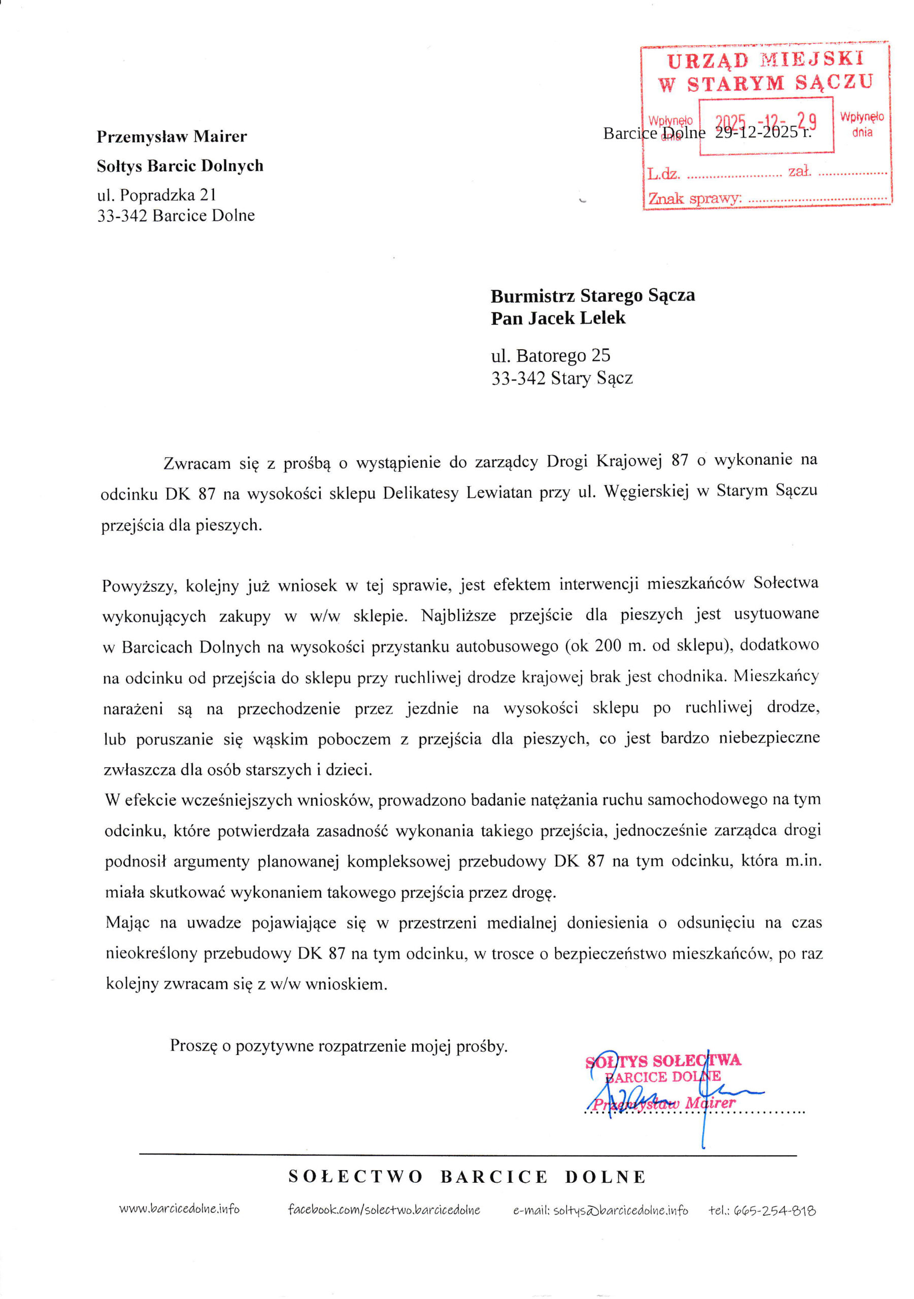 Odpowiadając na sygnały ze strony mieszkańców po raz kolejny zwróciłem się do Burmistrza Starego Sącza (pismem z dnia 29/12/2025 r.) z wnioskiem o wykonanie, lub zwrócenie się do GDDKiA z wnioskiem o wykonanie przejścia dla pieszych w okolicy Delikatesów Lewiatan w Starym Sączu, przy ul. Węgierskiej, tuż za granicą naszego Sołectwa.