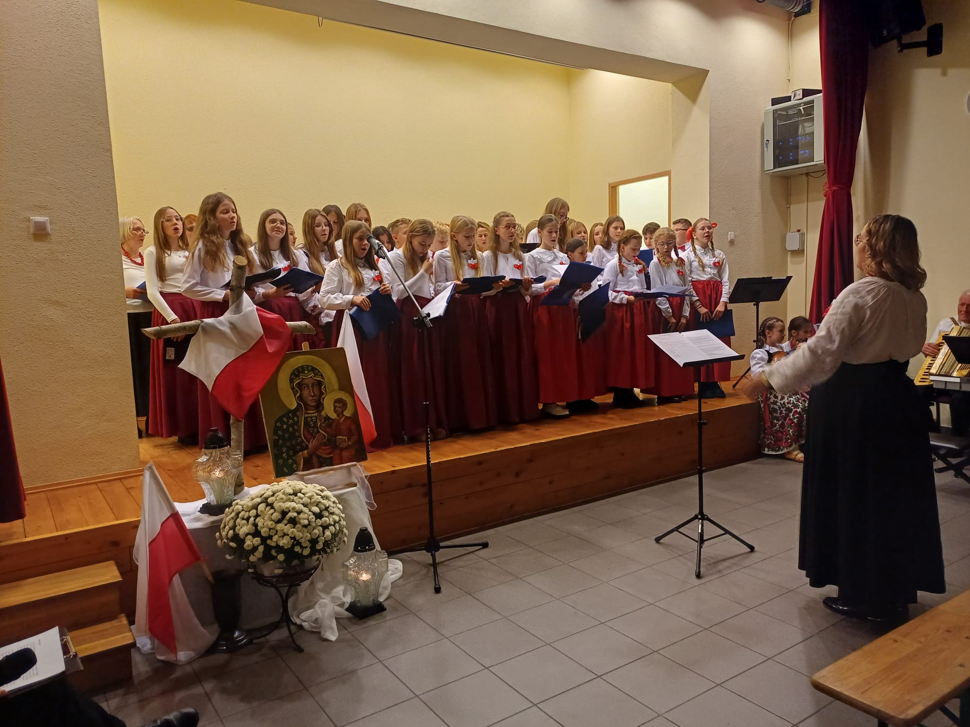 Wieczornica rozpoczęła się od wspólnego śpiewu Roty, a po niej uczniowie Szkoły Podstawowej im. Bohaterów Warszawy w Grywałdzie wykonali pieśni żołnierskie i legionowe z okresu I i II wojny światowej, przypominające o odwadze i poświęceniu tych, którzy walczyli o wolność Polski. Zebrani na widowni chętnie włączyli się w śpiew tych znanych melodii, w których zabrzmiała Polska – wierna tradycji, dumna z historii, ufająca Bogu. Z miłości do Ojczyzny wyrasta także twórczość zespołów regionalnych, więc wśród wykonawców znalazł się zespół regionalny „Małe Barcicoki”. Najmłodsi wykonawcy porwali swoim entuzjazmem do śpiewu wszystkich zgromadzonych.