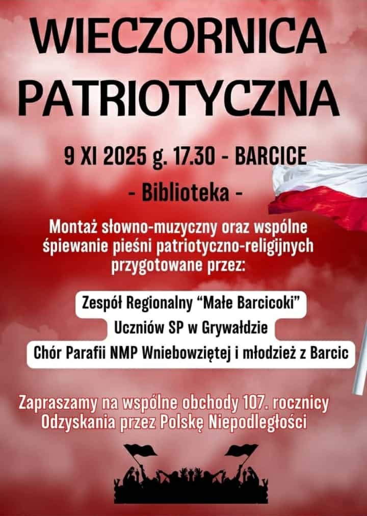 9 XI 2025 w filii Biblioteki Gminnej w Barcicach odbyła się uroczysta wieczornica patriotyczna, upamiętniająca 107 rocznicę odzyskania przez Polskę niepodległości. Wydarzenie zgromadziło licznych mieszkańców Barcic i okolic, dorosłych, młodzież i dzieci – wszystkich tych, którzy wspólnie chcieli uczcić ten wyjątkowy dzień w duchu pamięci o bohaterach Ojczyzny.